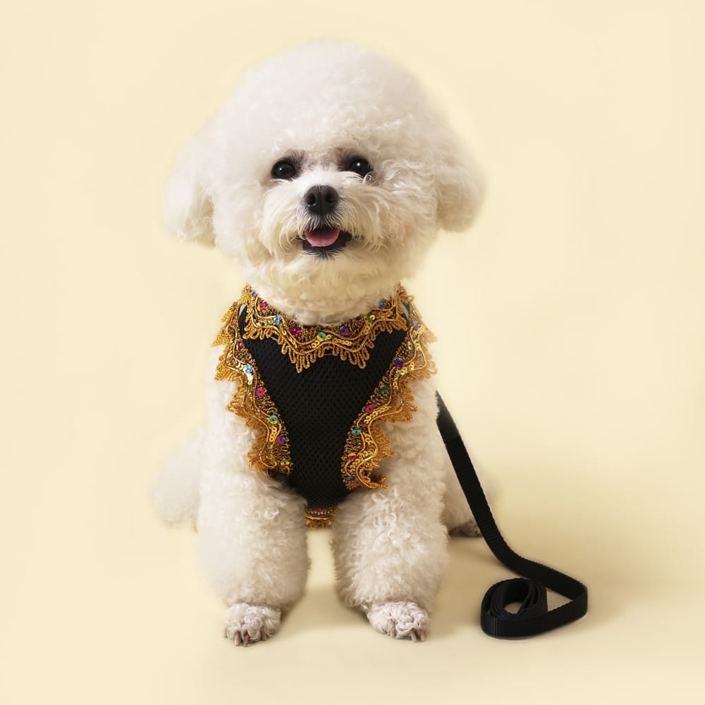 This harness set is designed especially for pets weighing between 3 and 13 pounds, with sizes tailored for the perfect fit. Unlike bulky or plain harnesses, this set combines elegance with practical comfort. The breathable mesh fabric ensures your pet won’t overheat, while the gold lace detail adds a fashionable touch. It’s perfect for everyday walks, trips to the park, or cozy outings where you want your pet to look and feel their best.