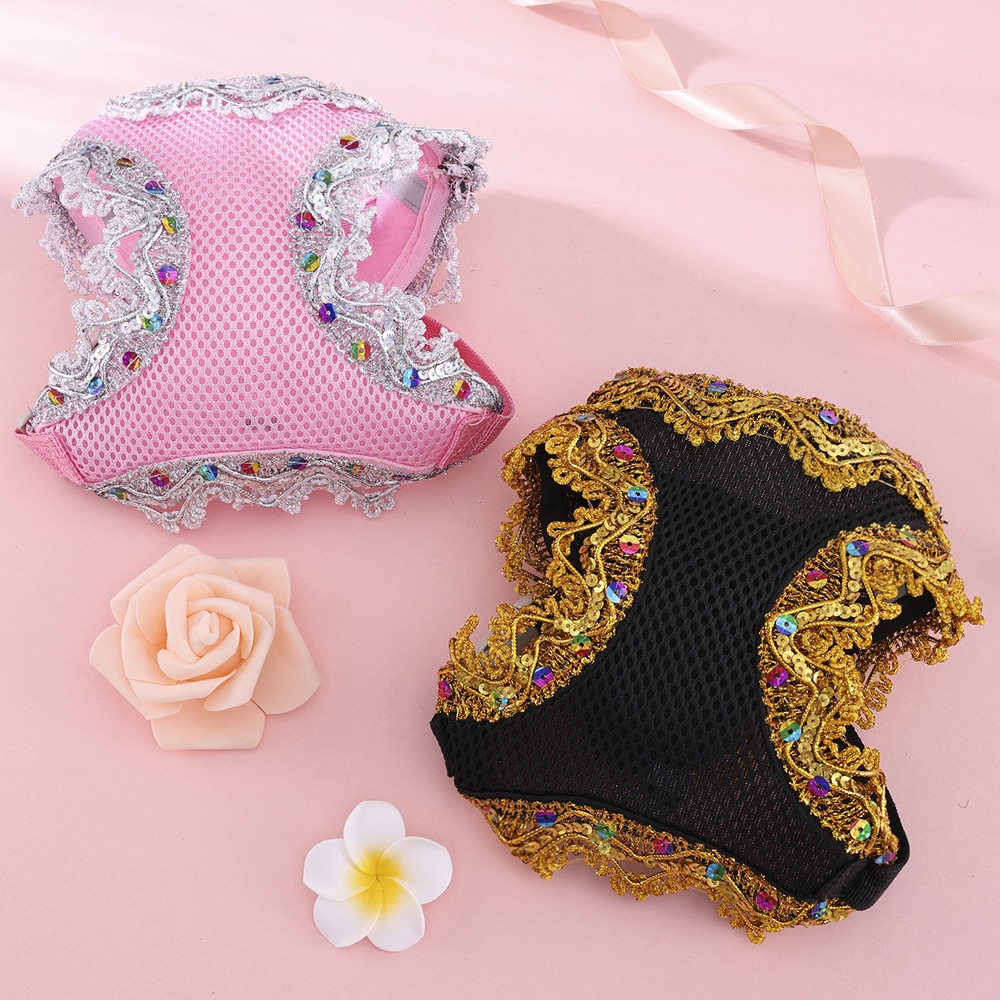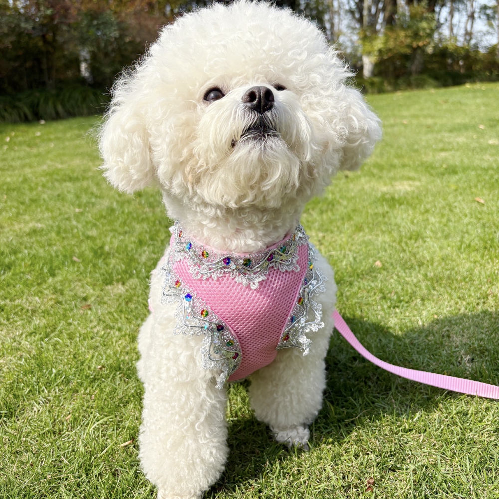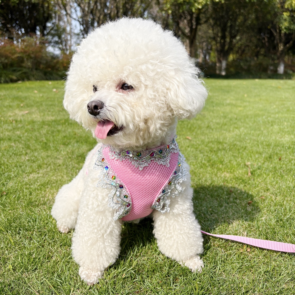 Give your small dog or cat the perfect combination of style and comfort with this breathable harness set featuring a delicate gold thread lace design. Crafted from lightweight mesh fabric, this pet vest is gentle on your furry friend’s skin while allowing air to flow freely, keeping them cool and comfortable during every walk. The soft chest vest fits snugly without restricting movement, making it ideal for daily outings, playtime, or even special occasions when you want your pet to shine.
