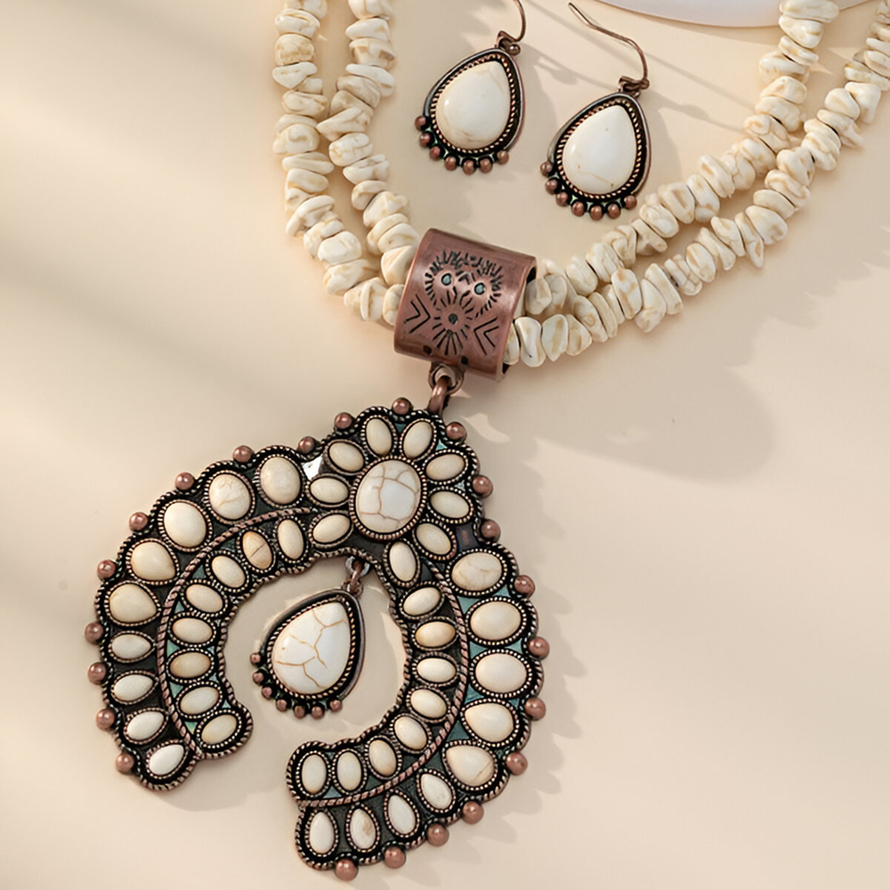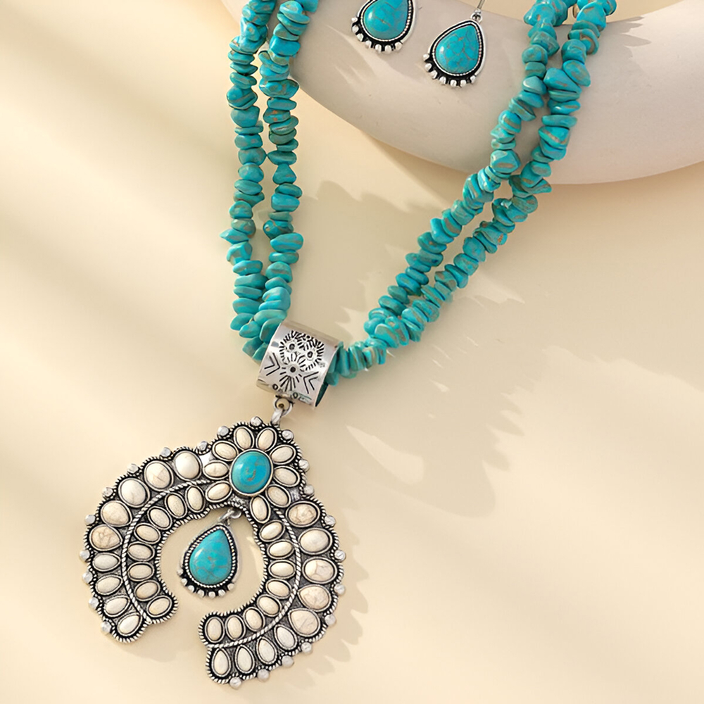 Elevate your jewelry collection with this vintage-inspired white turquoise squash blossom necklace and earrings set. Its unique design and elegant synthetic stones make it a must-have for anyone who values artistry and adventure in their accessories. Add this captivating set to your wardrobe now and experience the perfect blend of timeless beauty and modern boho chic.